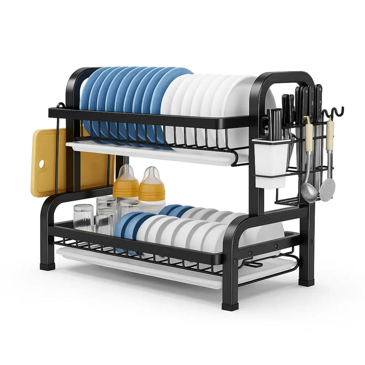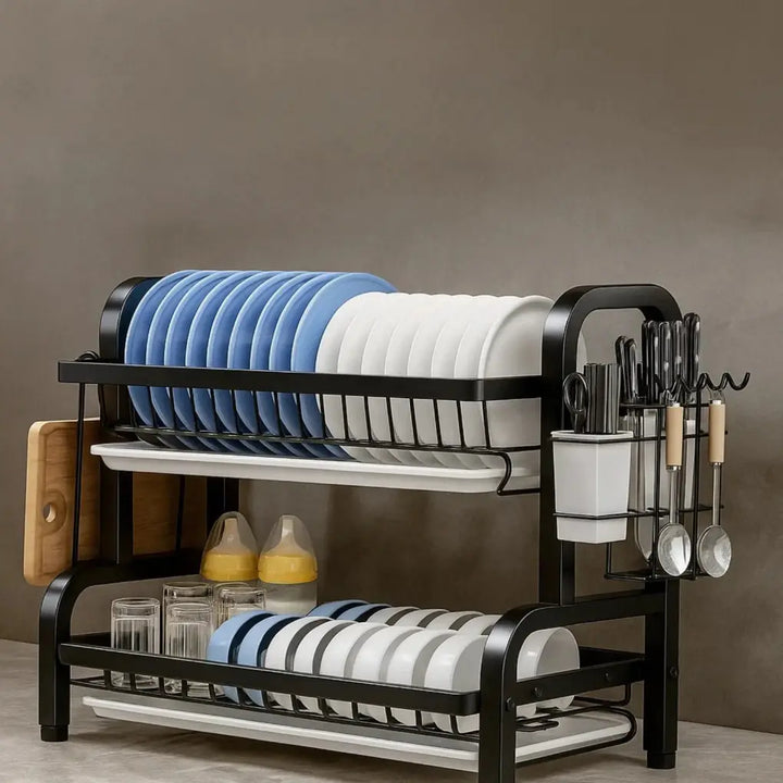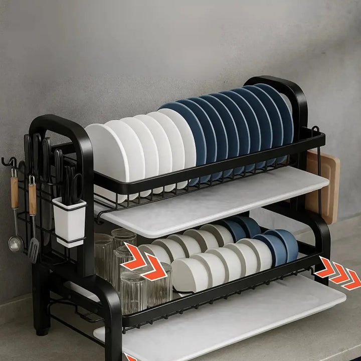Ideal para quem busca um escorredor durável, moderno e funcional, que mantém sua bancada seca e utensílios sempre organizados.