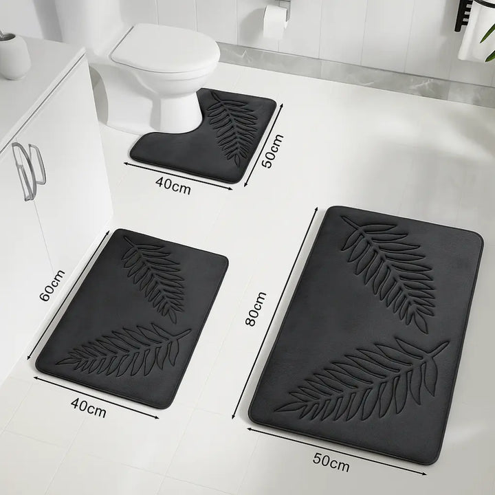 Transforme seu banheiro com o Kit Tapete Para Banheiro Ruka Preto. Este conjunto de 3 peças oferece absorção eficiente, secagem rápida e um conforto incrível com seu design de três camadas, proporcionando uma experiência de pisada macia e agradável.