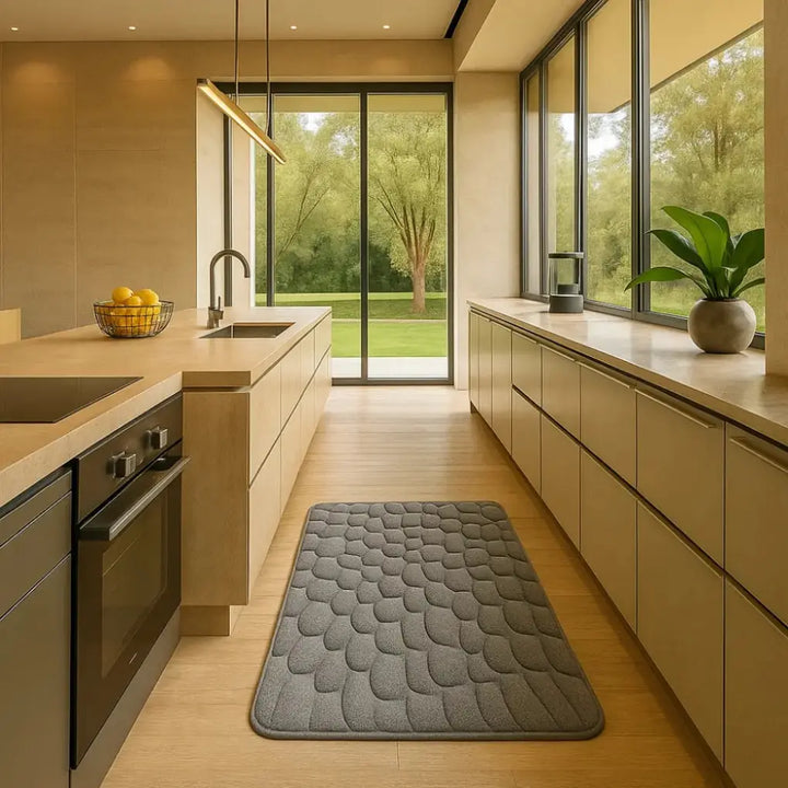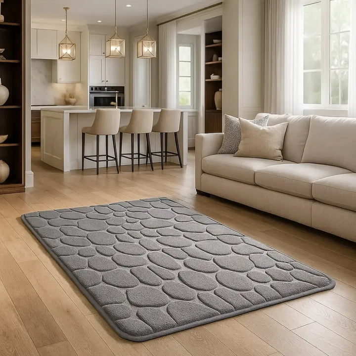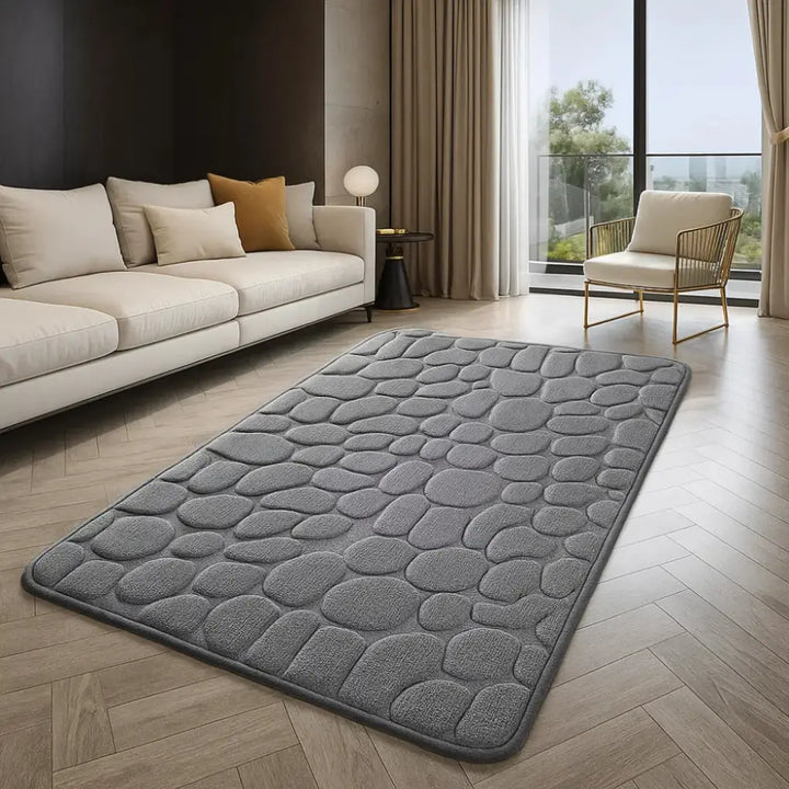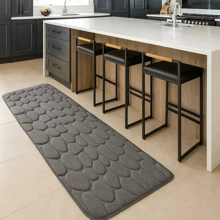 A textura em relevo oferece uma aparência sofisticada, imitando pedra, ao mesmo tempo que proporciona conforto para os pés.