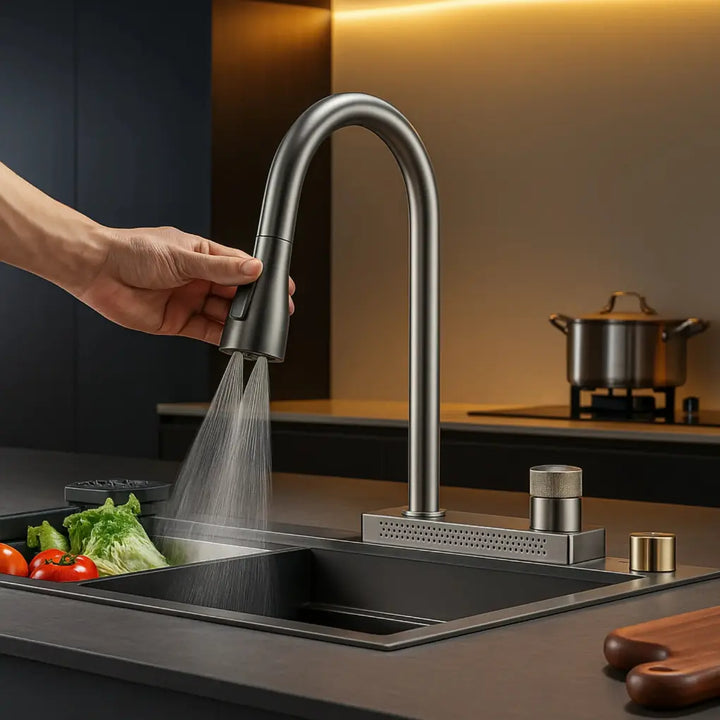 Com bico retrátil e giratório 360°, aquecimento elétrico 220V e acabamento em aço inox cromado, ela oferece praticidade, durabilidade e estilo para cozinhas modernas e planejadas.