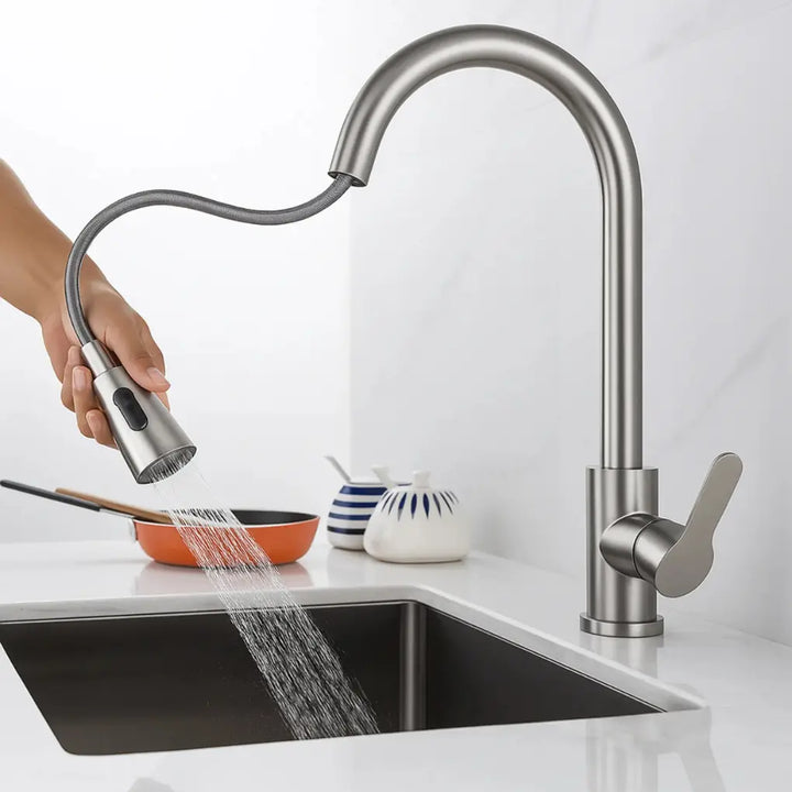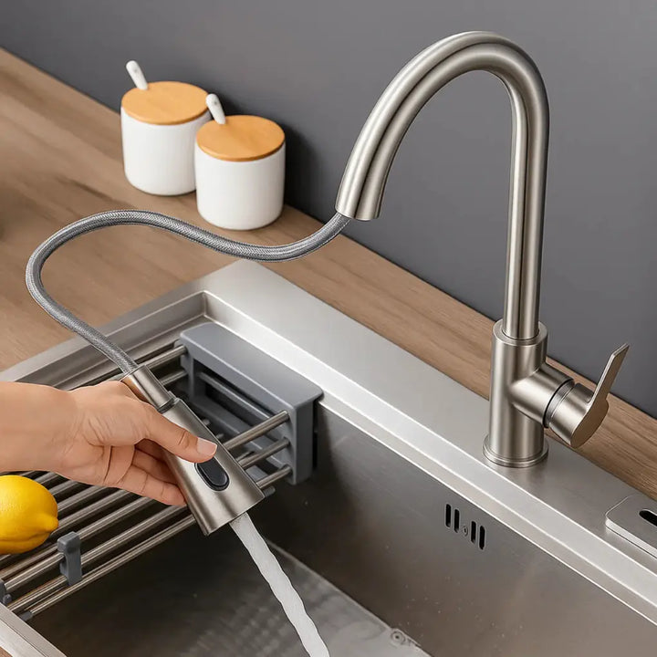 Com bico retrátil tipo pull-down, giro 360° e dois modos de jato, a Torneira Opus Silver oferece alta funcionalidade para suas tarefas na pia.