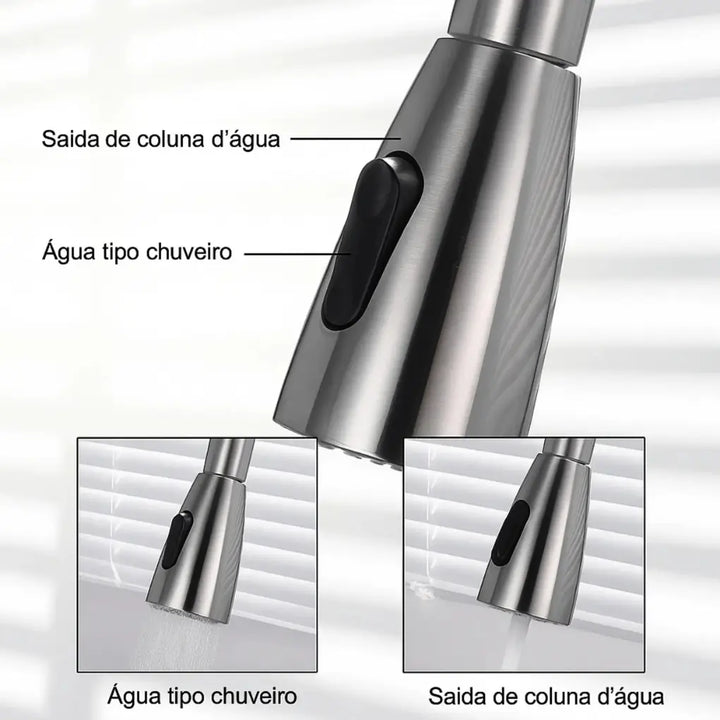 Pulverizador retrátil removível (pull-down): proporciona maior alcance para facilitar a limpeza da pia, utensílios e panelas.